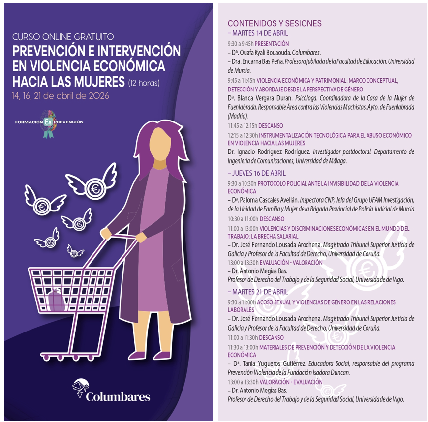 La Asociación Columbares, a través del proyecto “Formación es prevención” y en colaboración con el Ministerio de Igualdad y la Universidad de Vigo, impulsa el curso “Prevención e intervención en violencia económica contra las mujeres”, una formación especializada dirigida a profesionales que trabajan en los ámbitos social, educativo, jurídico y sanitario, con el objetivo de mejorar la detección e intervención en este tipo de violencia.